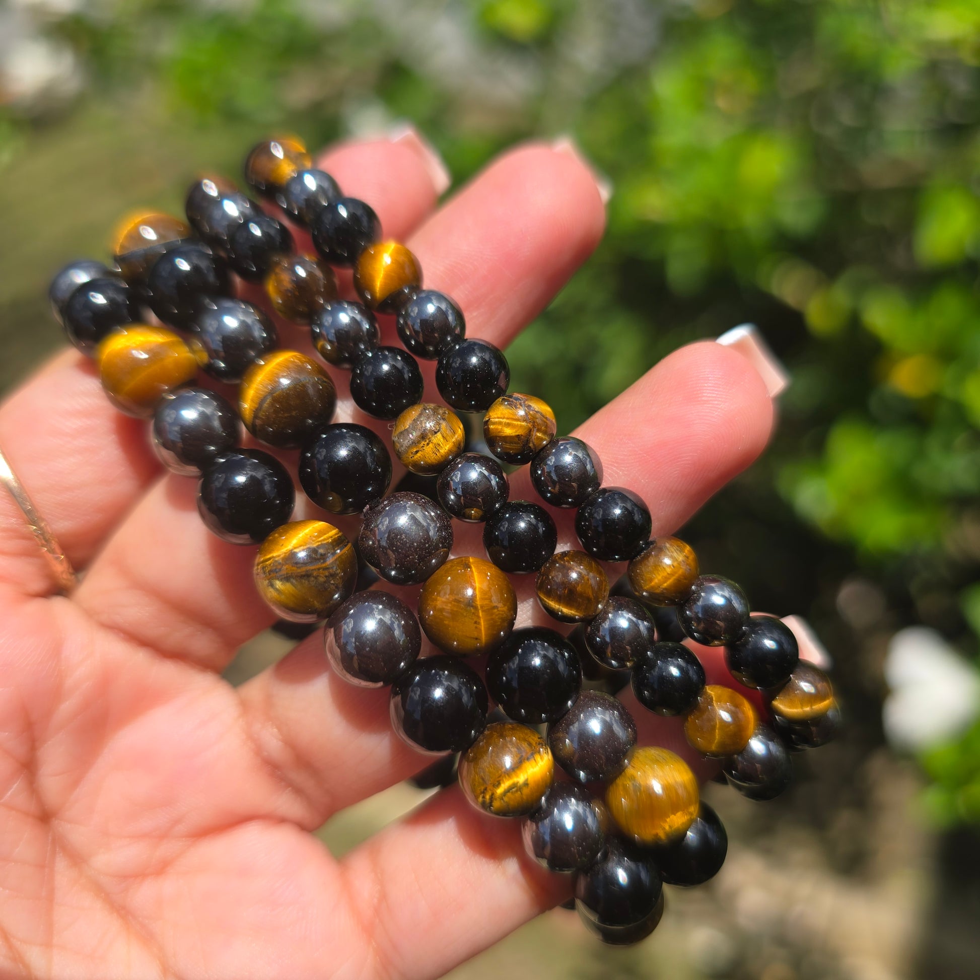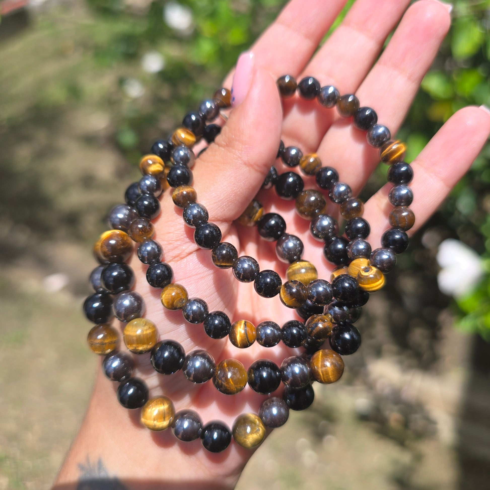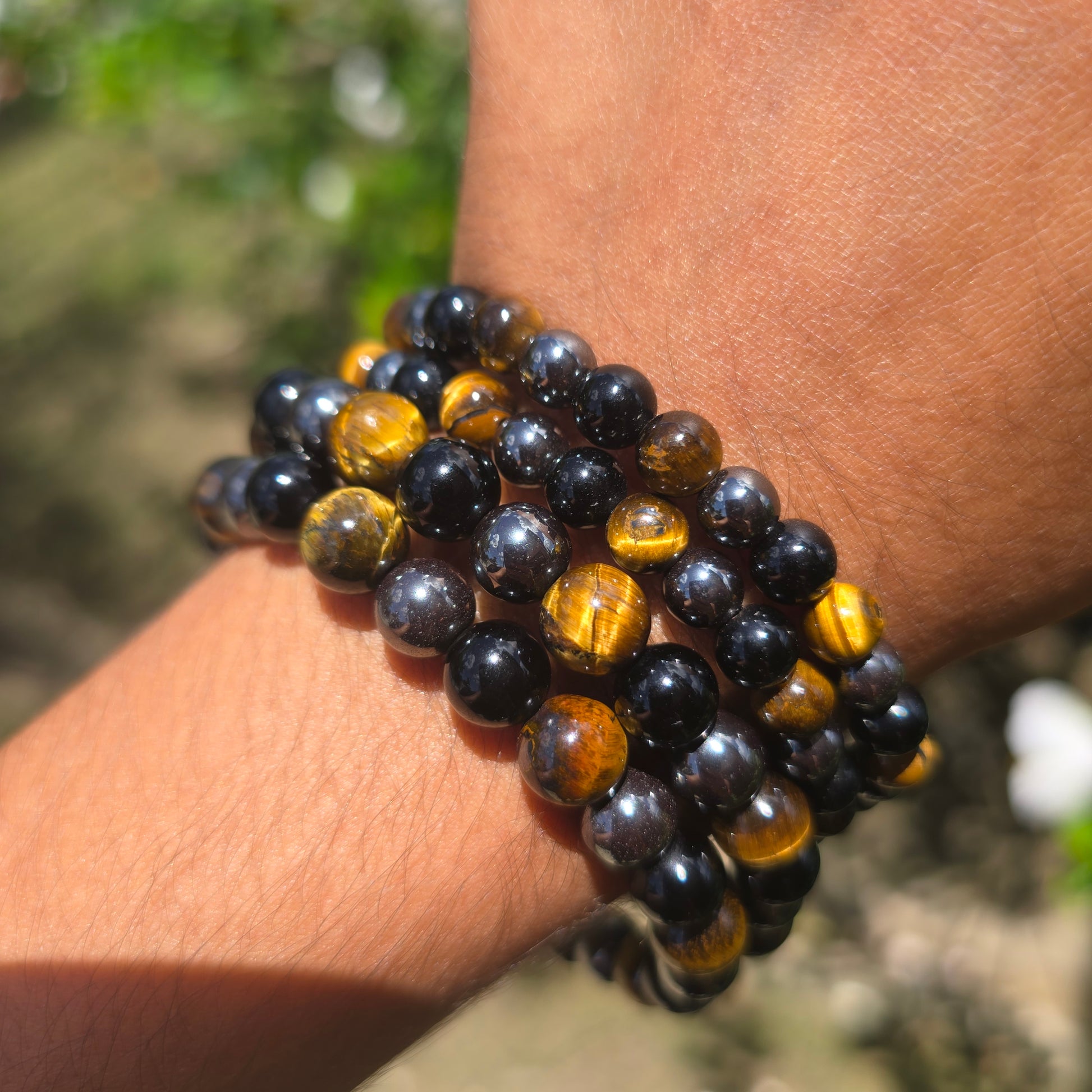 A triple protection bracelet typically combines three powerful stones known for their protective qualities. While the specific stones can vary, a common combination includes Black Obsidian, Hematite, and Tiger’s Eye.